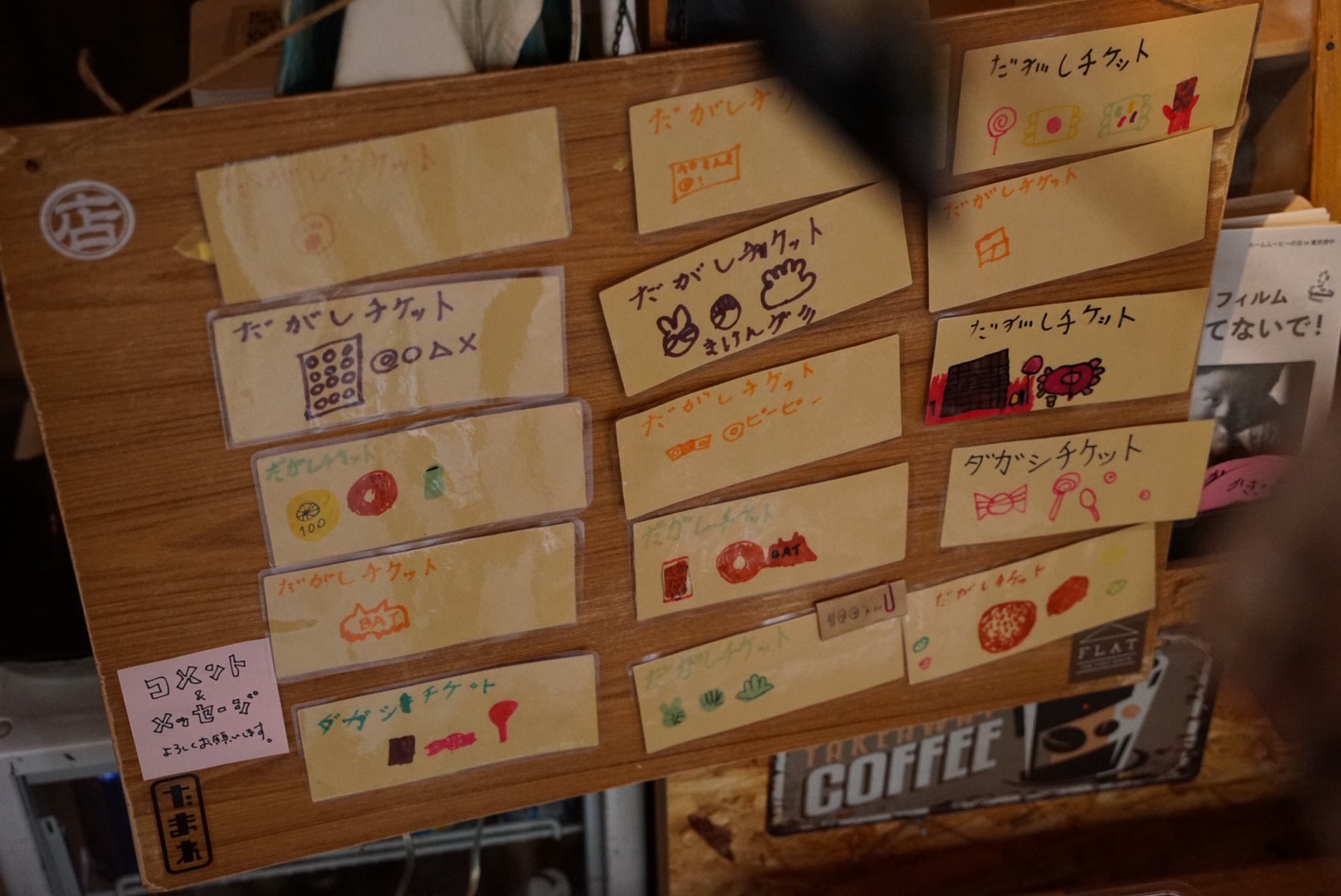 このチケットをとって、若者スタッフに渡したら100円分の駄菓子をもらったり、あそべます!
